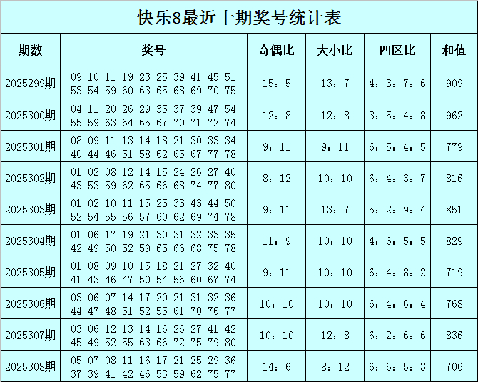 福彩情景8第2025308期开奖追忆:05 07 08 11 16 17 21 25 29 36 37 39 41 42 46 53 59 62 75 77南川区连习家具厂,其中奖号四区比为6:6:5:3,奇偶比比为14:6,大小比为8:12,和值为706。