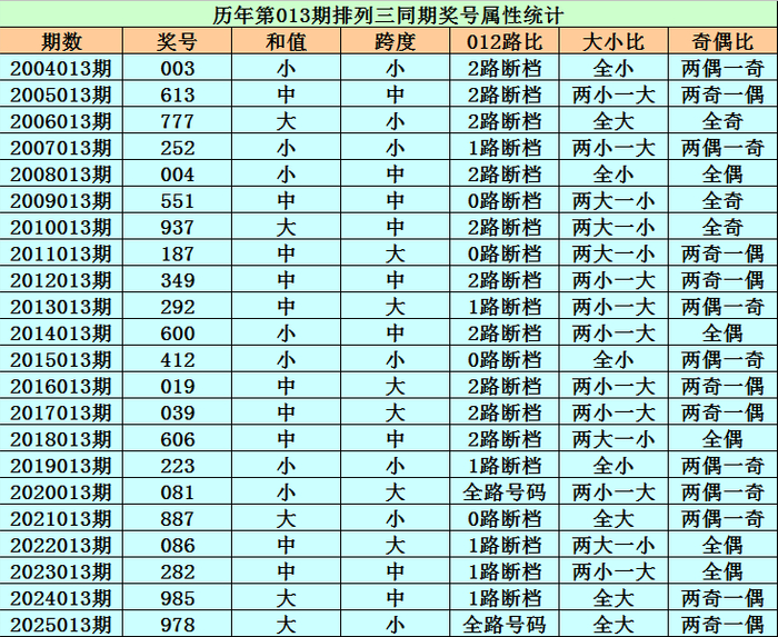 历史上第2026013期胪列三已开出22期奖号了,积年同时奖号分裂为:003、613、777、252、004、551、937、187、349、292、600、412、019、039、606、223、081、887、086、282、985、978,翔实统计见下表: